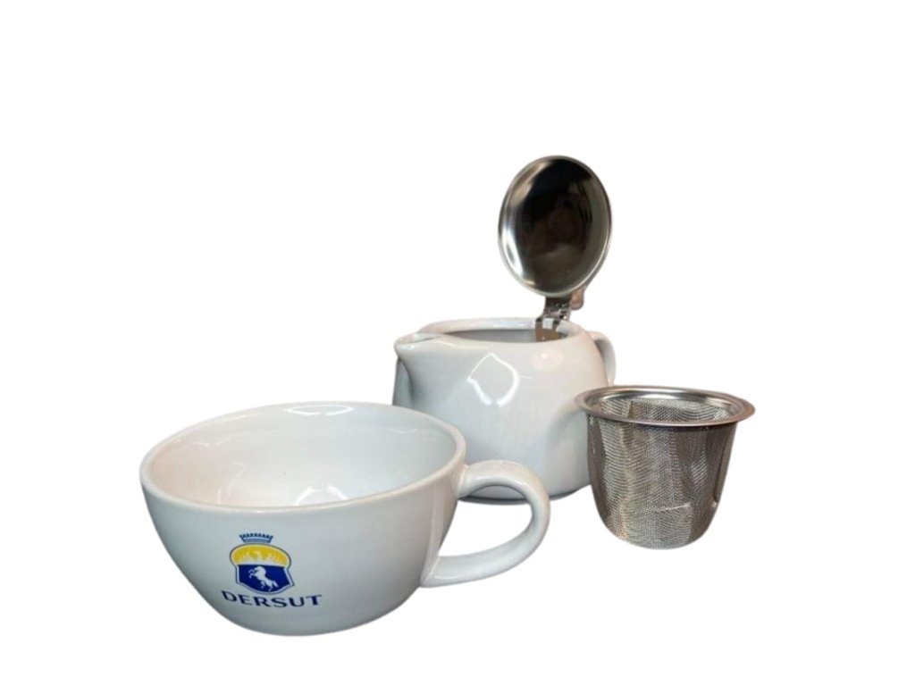 Teeservice - Teekanne mit Sieb aus Edelstahl und Becher aus Hartporzellan mit Dersut-Logo.